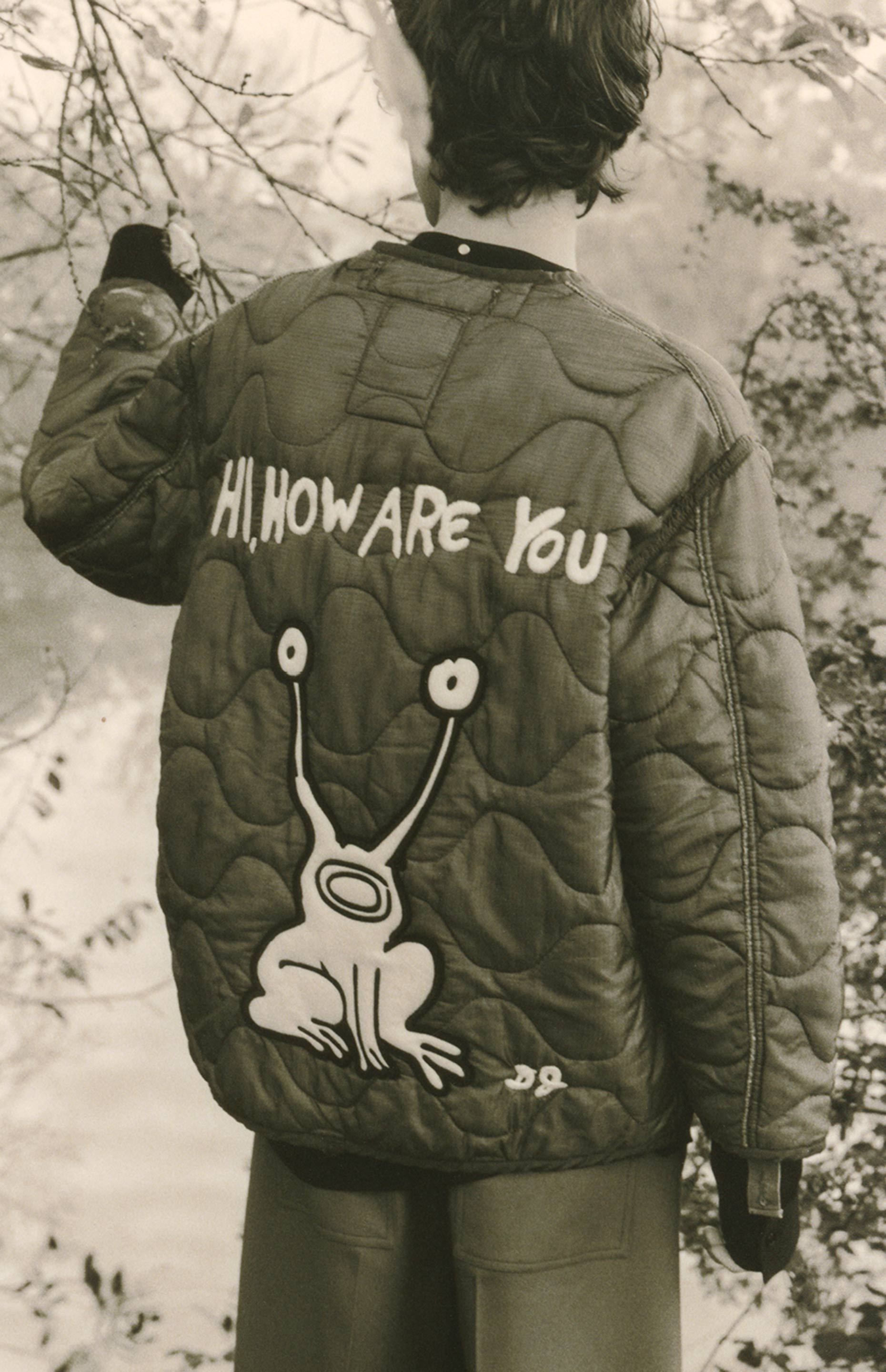 ダニエル・ジョンストンのエレミヤ・ザ・イノセントと「Hi, How Are You」のウール刺繍でライナー、クルーネックスウェットとフーディを飾り、ダニエル・ジョンストンのノートブックから採った他のアートワークを、特殊レジンでコーティングしたコットン製ワッペンや、ウェアに直接プリントしました。