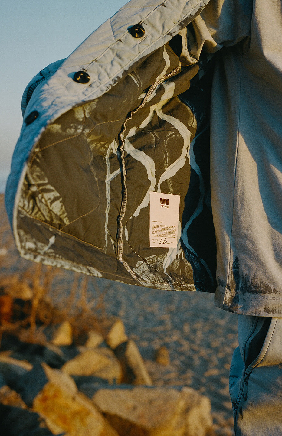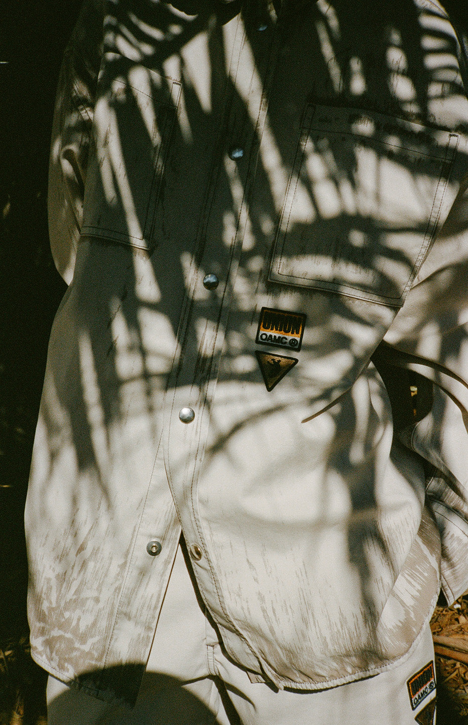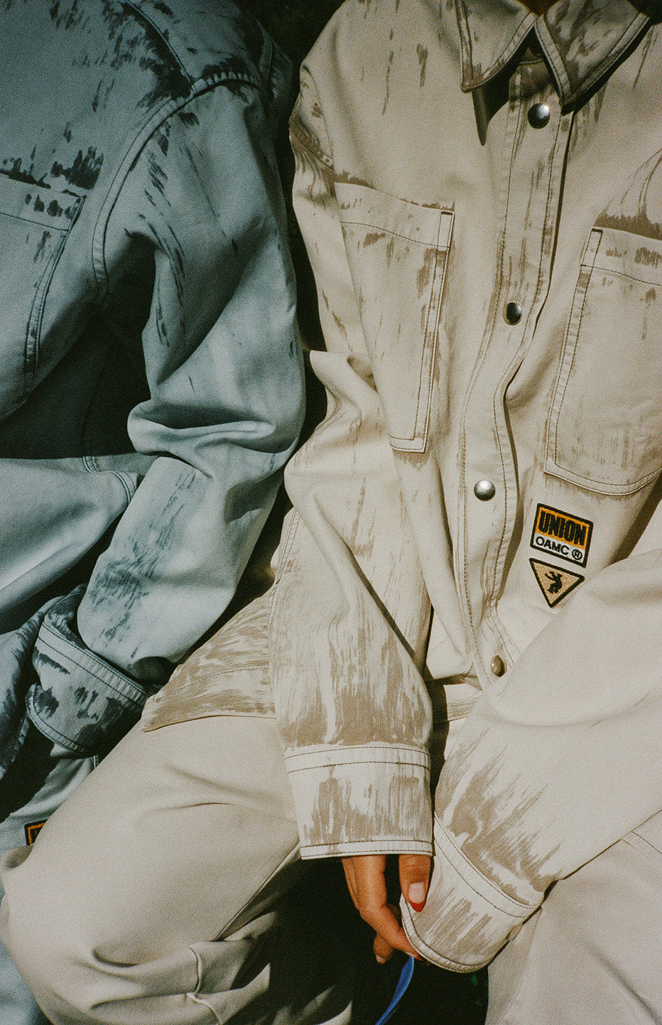 OAMCとUnionのロゴをあしらったこれらのアイテムには、ガーメントダイ工程の前に布地にハンドペイントを施し、一点ものの魅力を与えました。