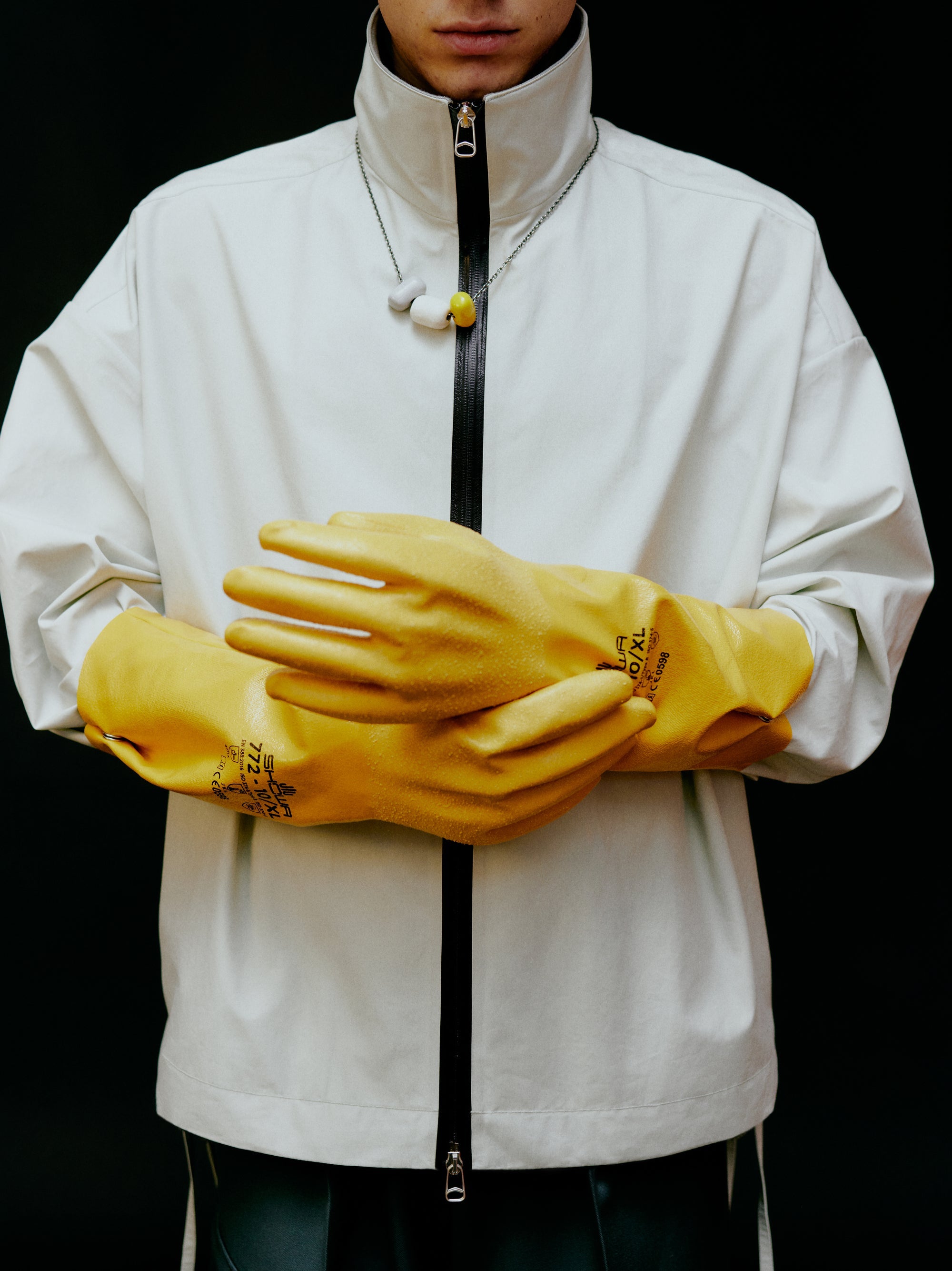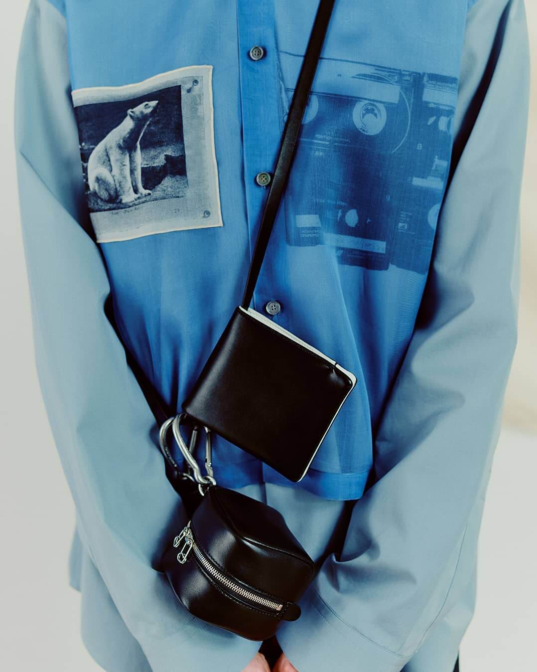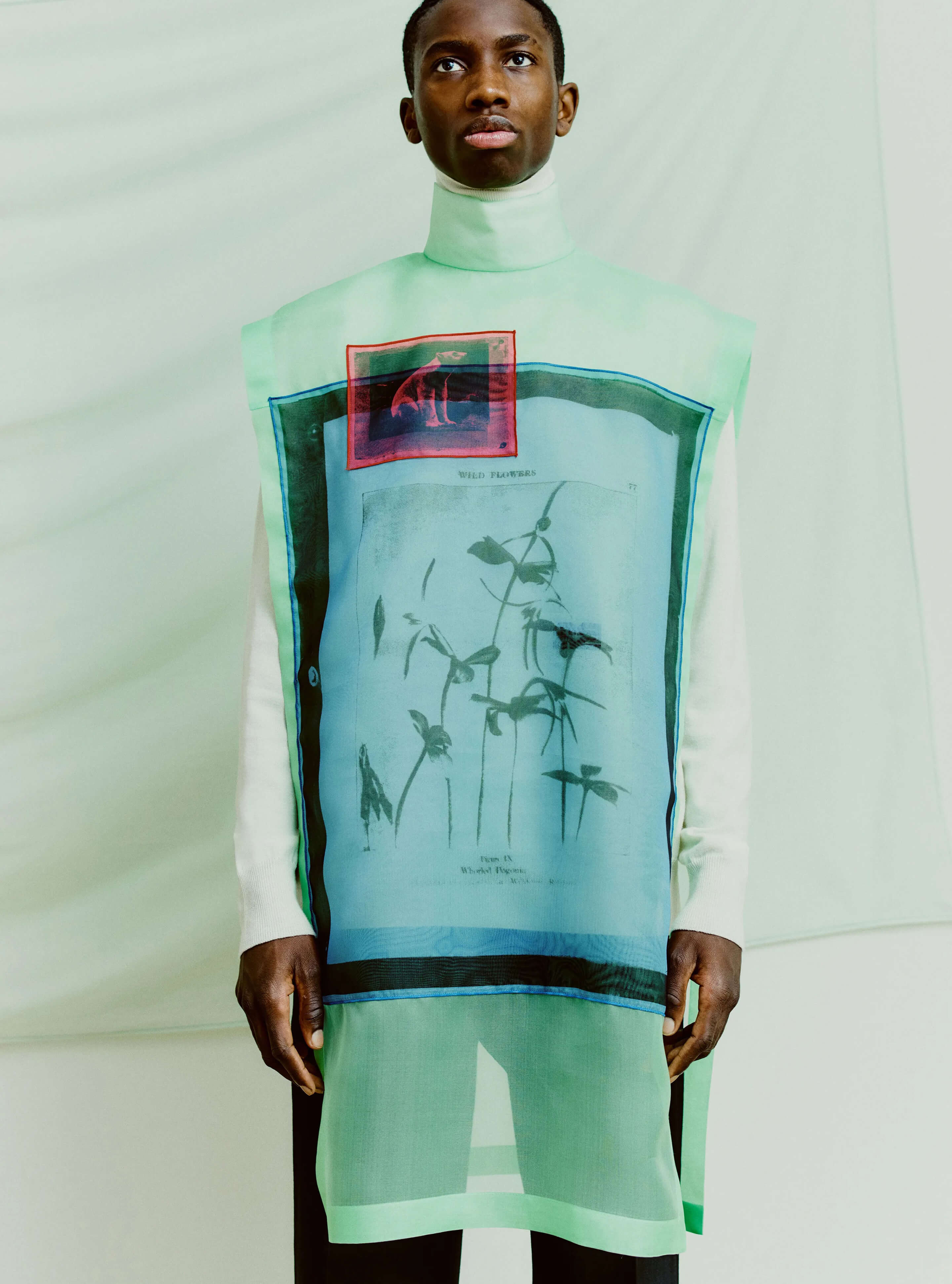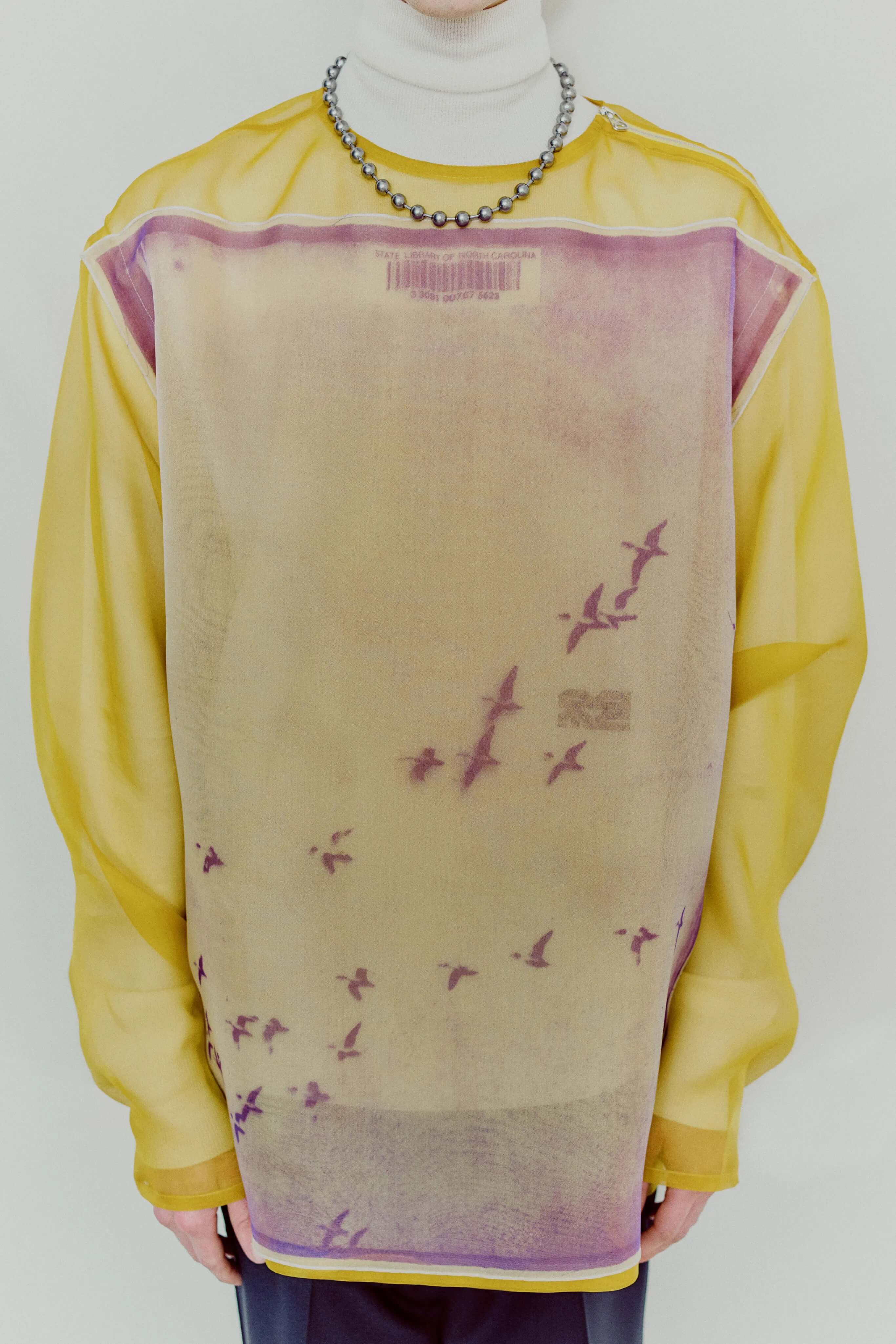 コレクションが浮上するにつれ、アートワークの視覚的言語さえも発展的な視点を見つけ出した。不完全な幾何学的形状を、見つけものと作成したイメージを切り貼りして作り出したのだ。人工的な装飾と手仕事のタッチが、恣意的なアナログ感を表現する。一見ミリタリーのようなパッチは手刺繍仕上げ。花や海鳥の穏やかなイメージや、ロブスターやペリカンの超現実的なイメージを加えている。この瞬間にいかに逞しくなれるか、どんなに唐突な展開になっても、この世界の美しさや柔らかさを忘れないことが大切だという解説。