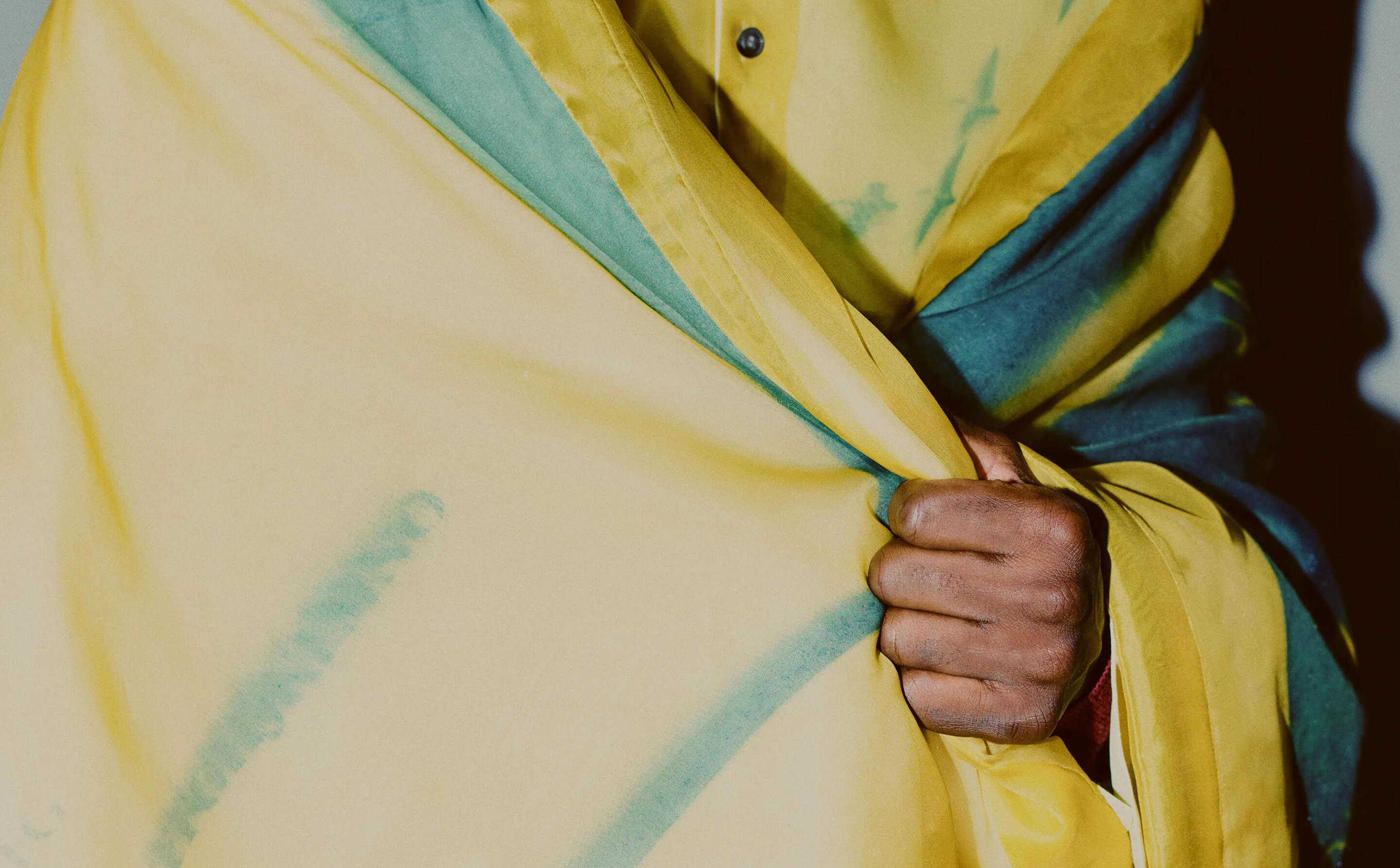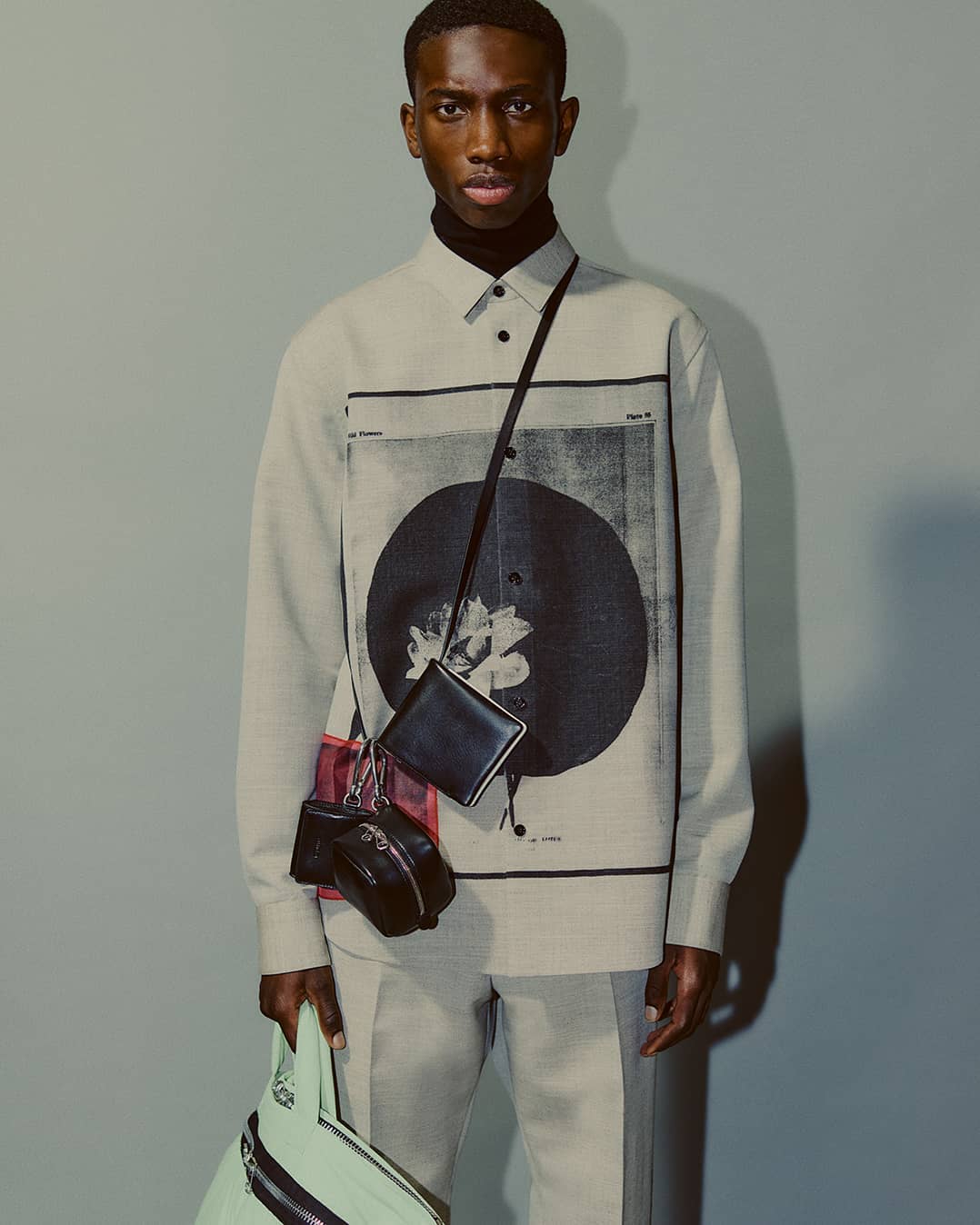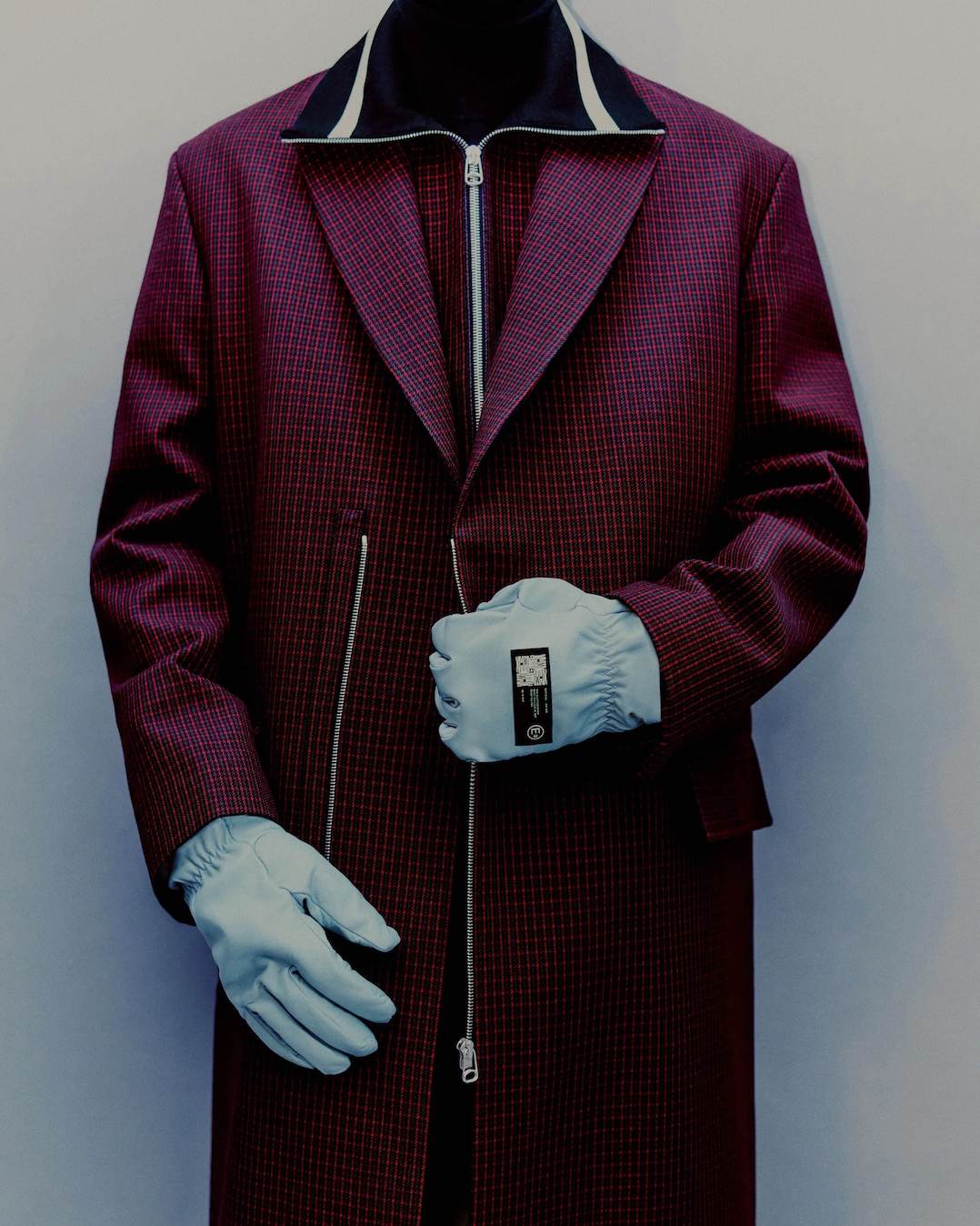 Collages and assemblages. In Rauschenberg’s vocabulary, ‘combines’. The idea of mixing materials, which Rauschenberg gained through his experience in his first year at the legendary black mountain college, under the guidance of Josef Albers. This idea is often at the root of design: finding the correct balance and vibration between two different materials, colors, or techniques, and was the initial starting point for the Fall/Winter 2021 collection. Mixed materials take the form of organza panels applied to sharp Japanese wool or cotton poplin overshirts, chunky knit collars attached to wool coats, and heavy metal hardware cutting through tailoring, shirting, footwear, and accessories.