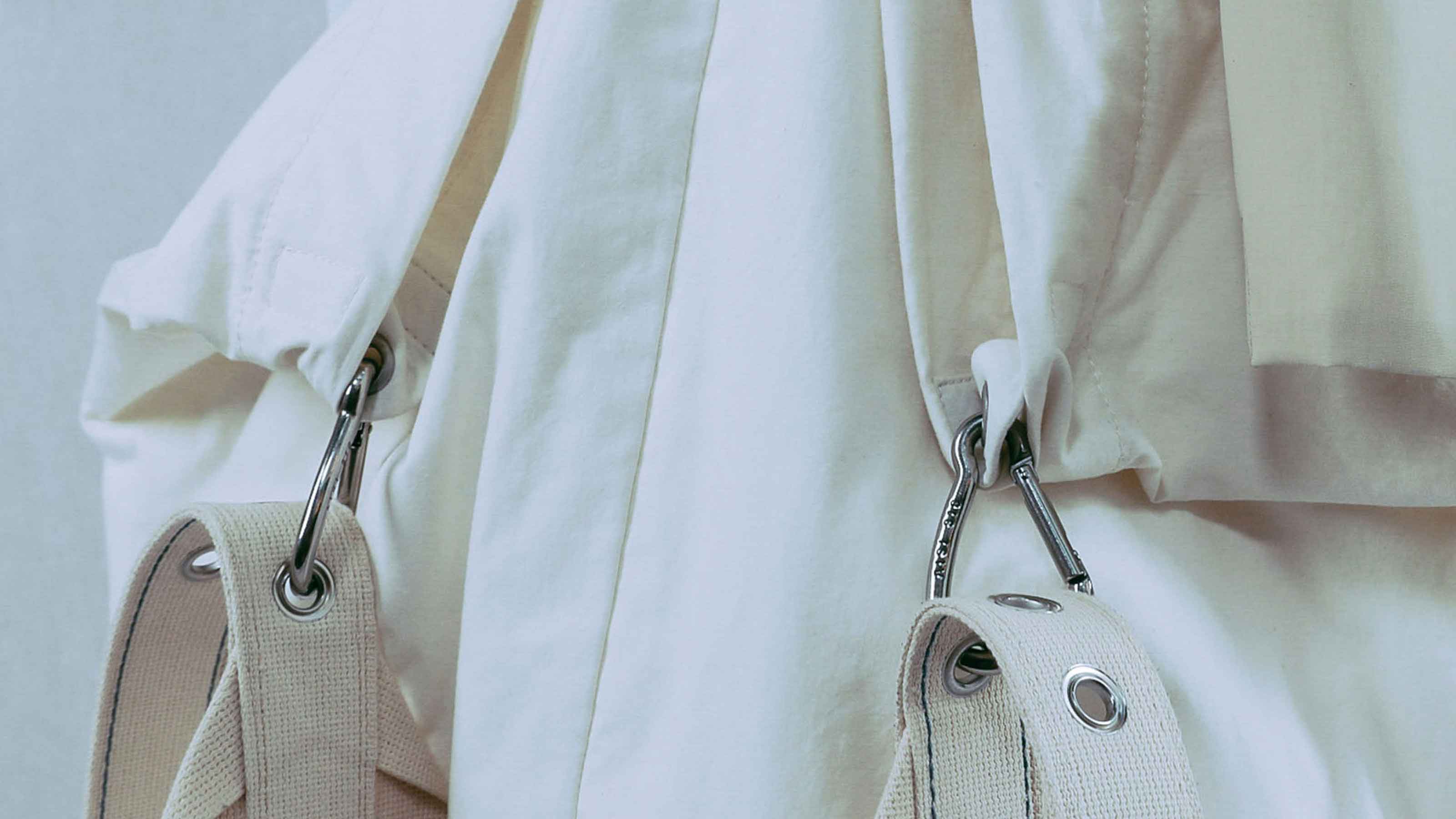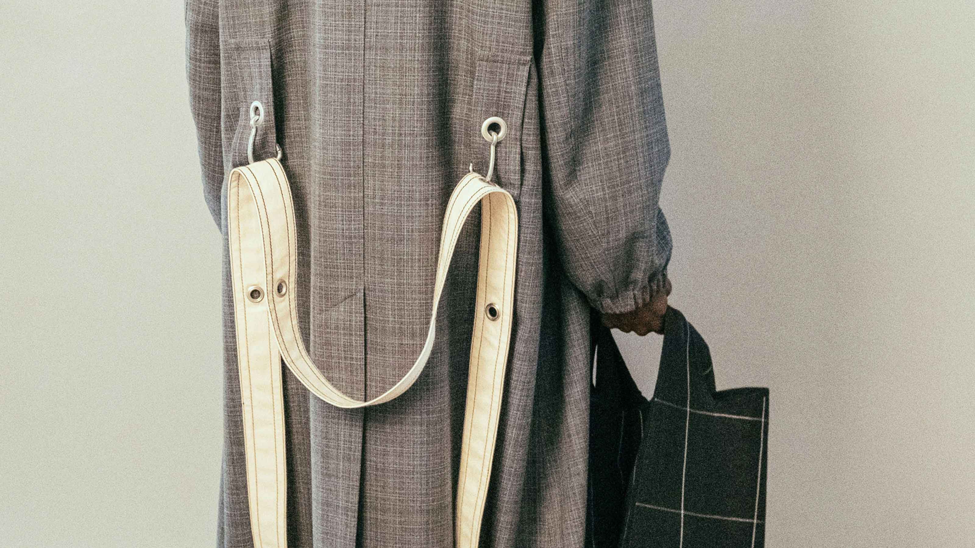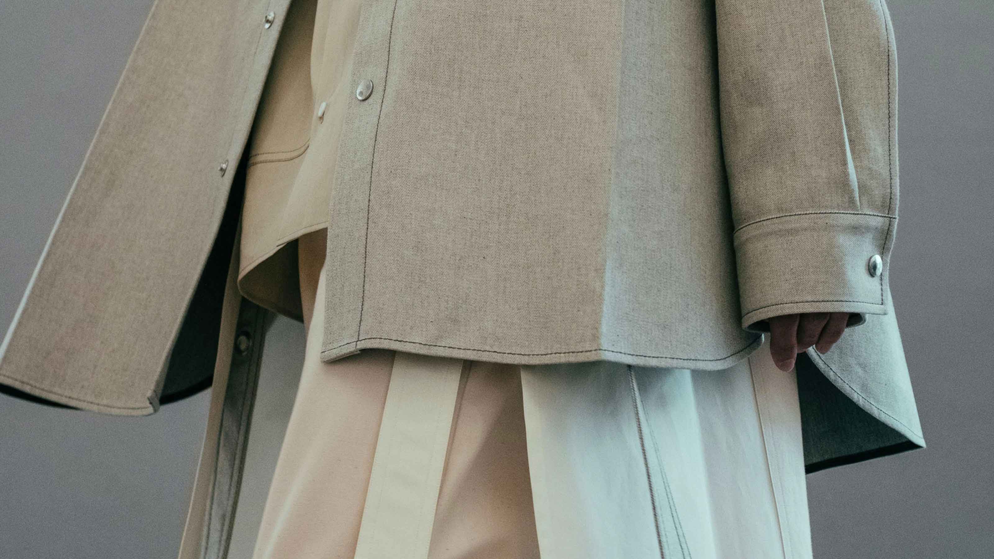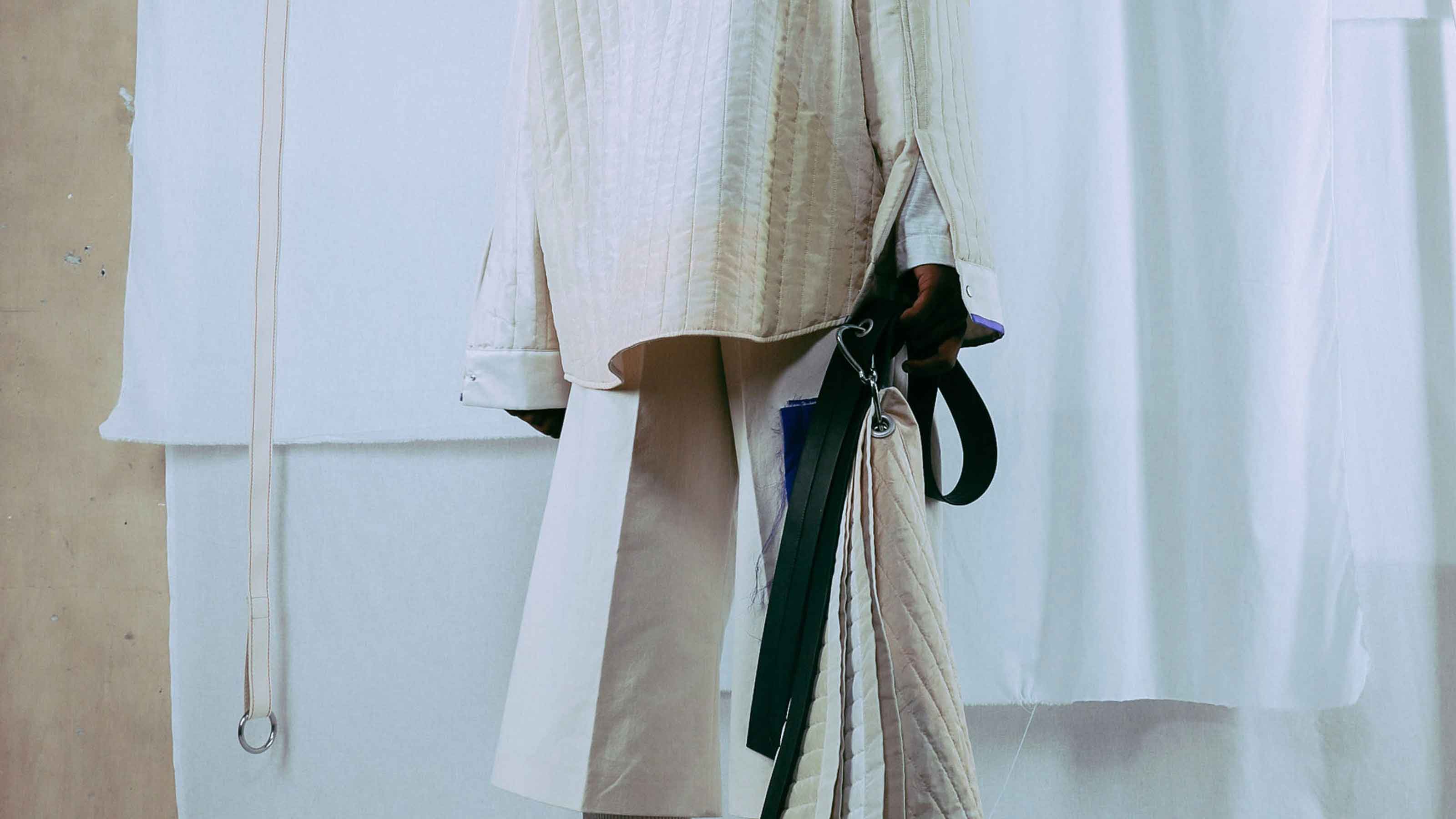 シルエットは軽やかなレイヤードスタイル。ベルトで締め、インダストリアルな金具で留めた膨らみのあるトップコートを、カットオフ仕上げのチーズクロス製シャツに重ねています。ボクシーなテーラリングやユーティリティシャツにはプレス加工で鋭角に仕上げ、細身でシャープなトラウザーズを合わせることで、長めでエレガントなシルエットを作り出しています。ひざ下でカットしたたっぷりとしたショートパンツと、軽やかでギャザーを寄せた、短めのドローストリング入りトラウザーズには、ロング丈のリブ編みソックスや、脚全体を覆うフルレングスのソックブーツを合わせました。マクロな質感の斜めリブニットや、オープンステッチのダブルフェイスモヘアコットン製セーターは、ユーティリタリアンなエプロンの上に重ねたり、ギャザーを寄せてウエストを絞ったりしてスタイリングされています。シャープで幾何学的なカットのレザーシャツやコートに、プリントボイルのスカーフやブランクーシの「眠れるミューズ」をモチーフにしたシャツを合わせました。ピローバッグには丈夫な革紐ハンドルを付けることで強度を増し、レザーやフリンジ付きコットンモスリン製のスカーフを三角形に結んでいます。軽やかなシルクのキルティングを重ね、水彩画のようなモチーフをあしらいました。
