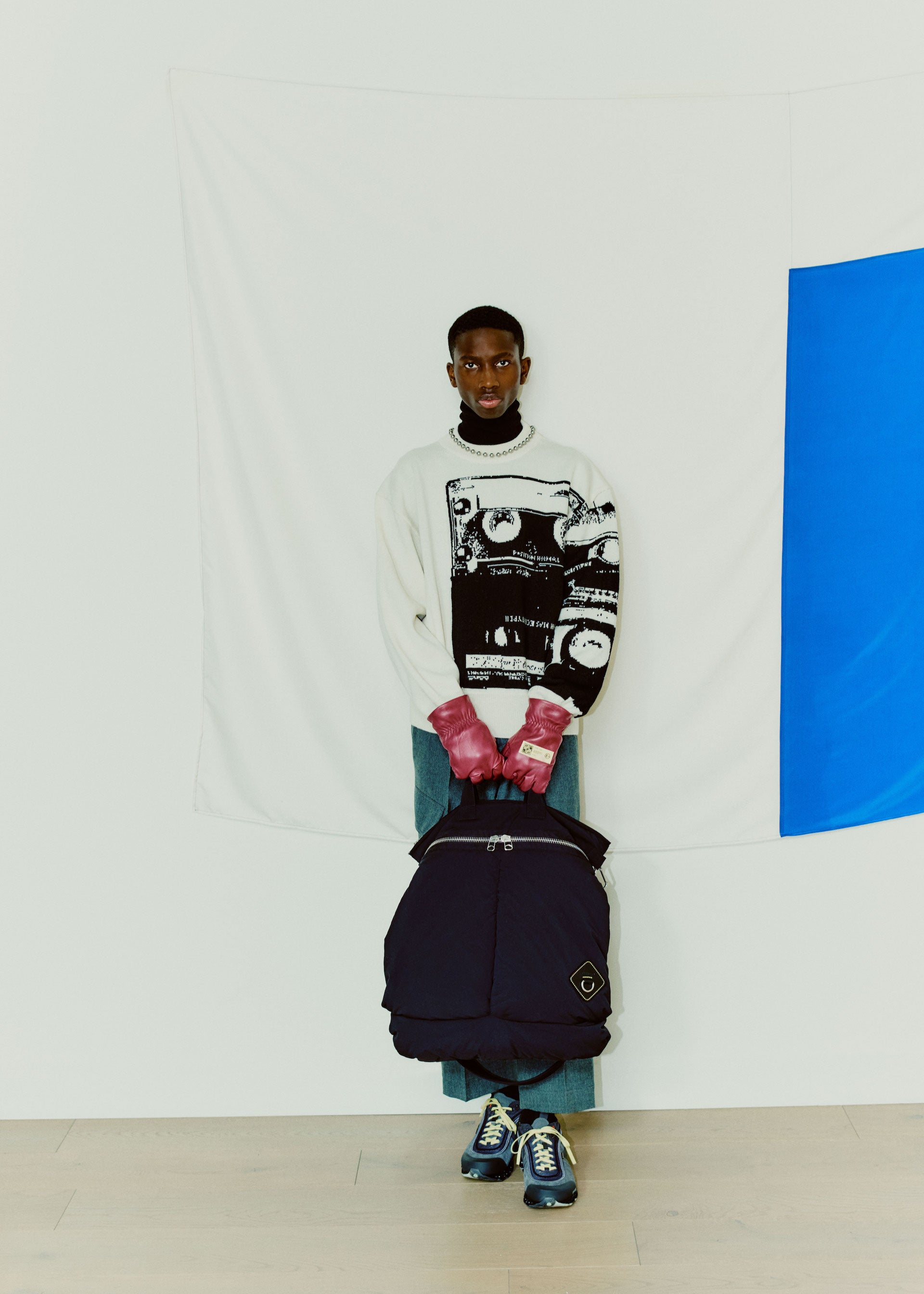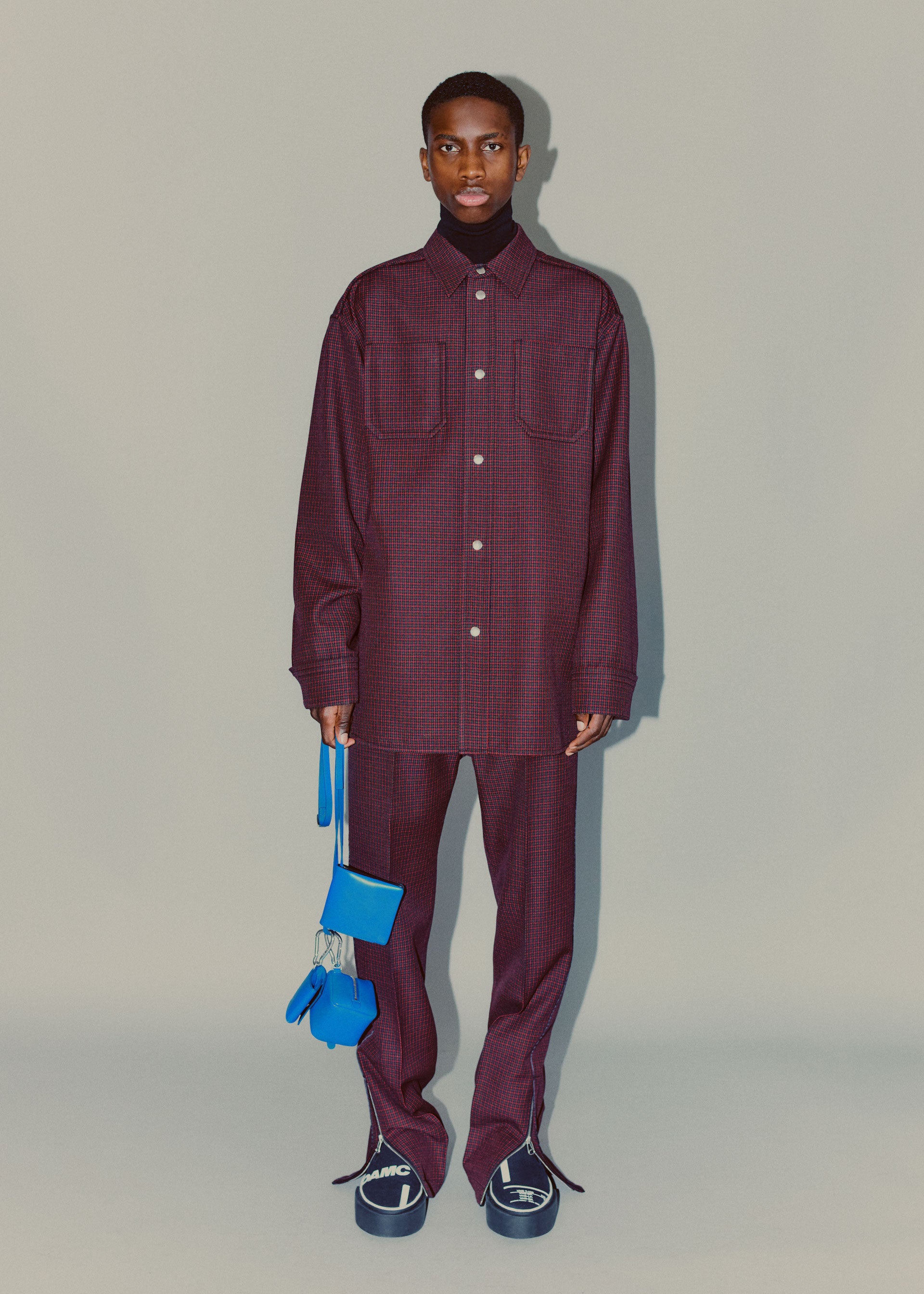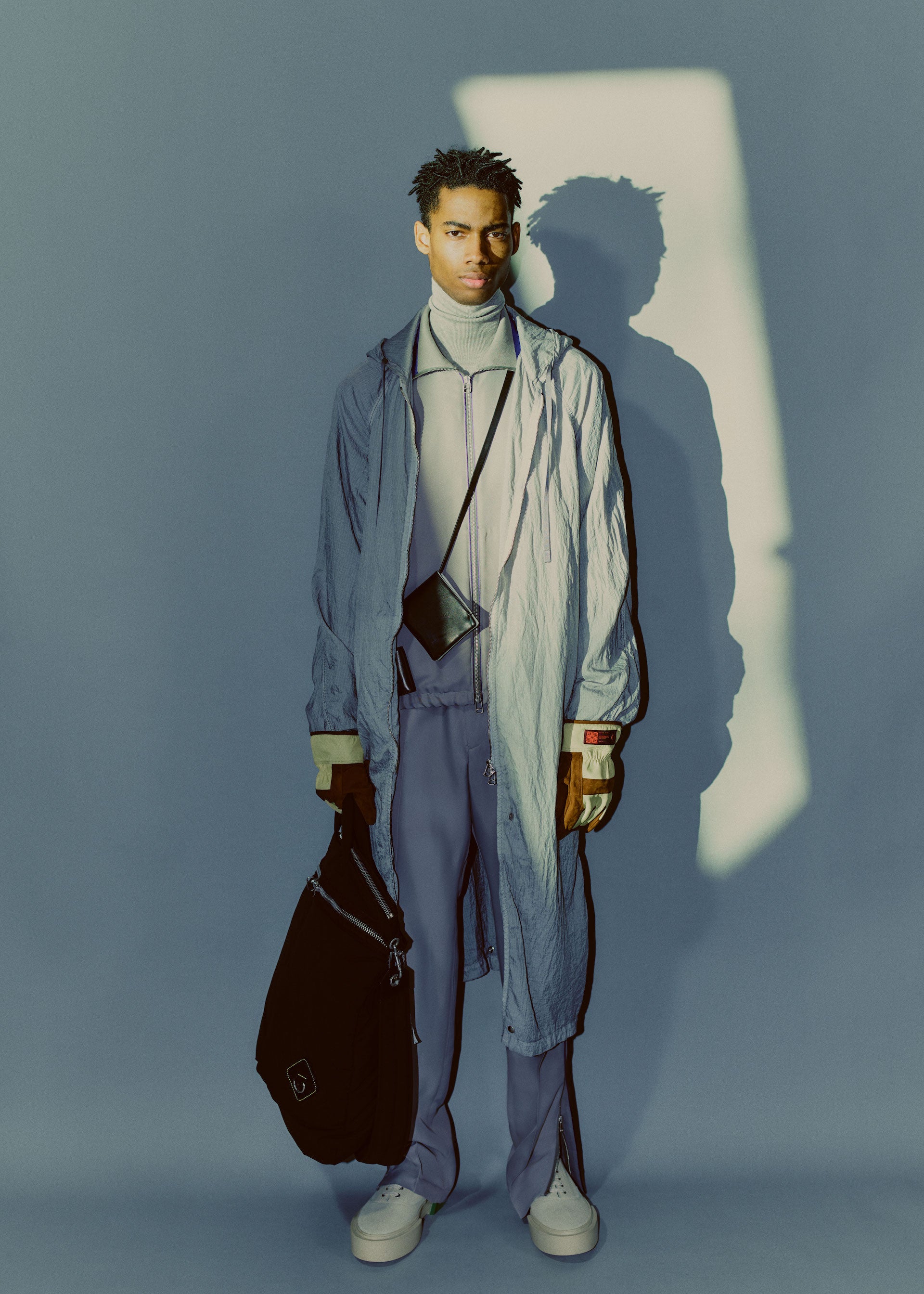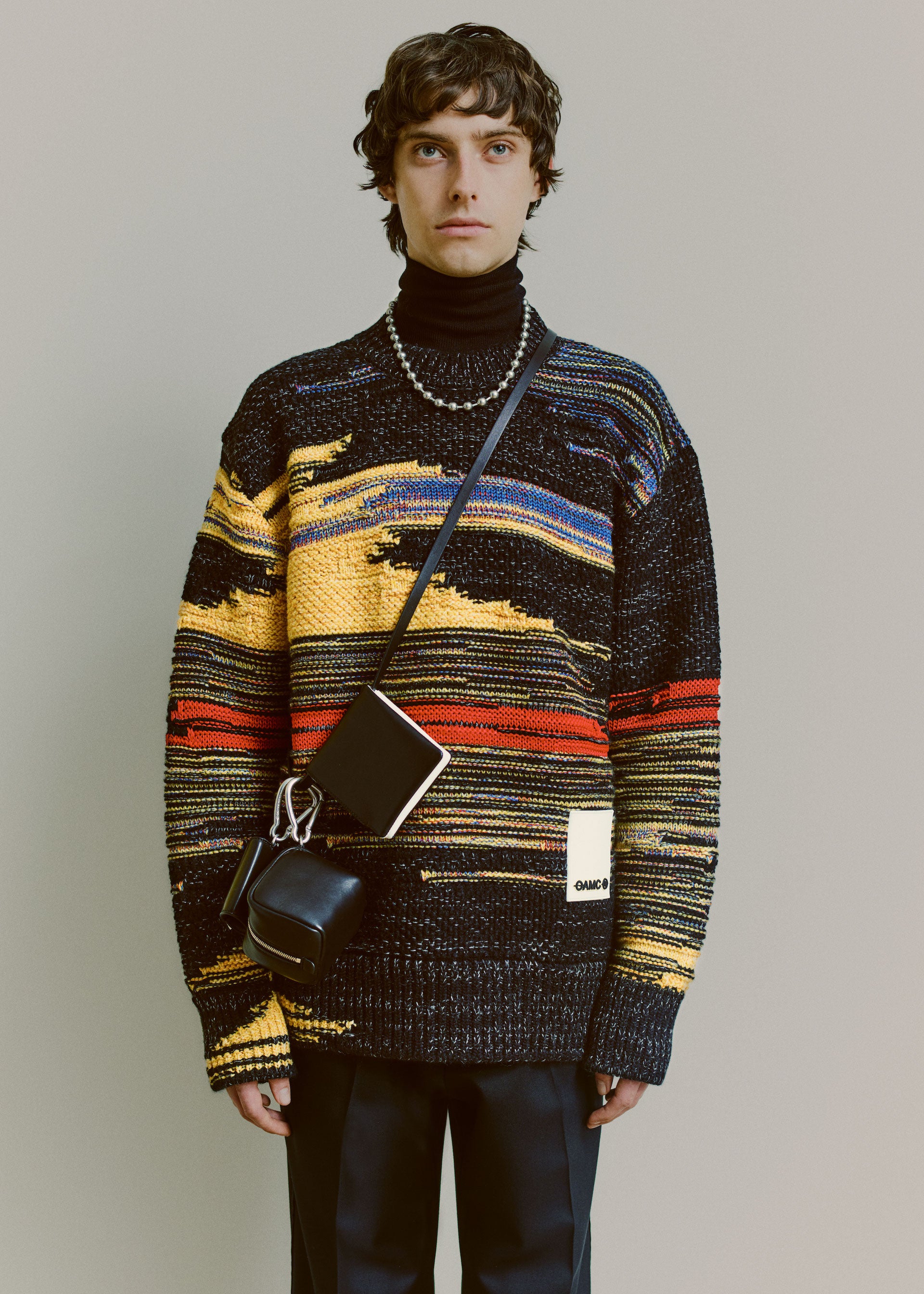Accessories reflect both the collage approach as well as transparency. Gloves are mixed material and industrial, bags and cross-body small leather goods are supple and inflated, with hard metal detailing, and necklaces are strong link metal chains intricately woven with utility cords. Continuing the collaboration with adidas, OAMC has designed the Type O-9, featuring the bounce outsole and sculpted transparent TPU upper pieces that envelop the shoe, revealing the high-pile suede and leather panelling underneath. Utility boots are flooded in color, featuring custom tinted Vibram outsoles.