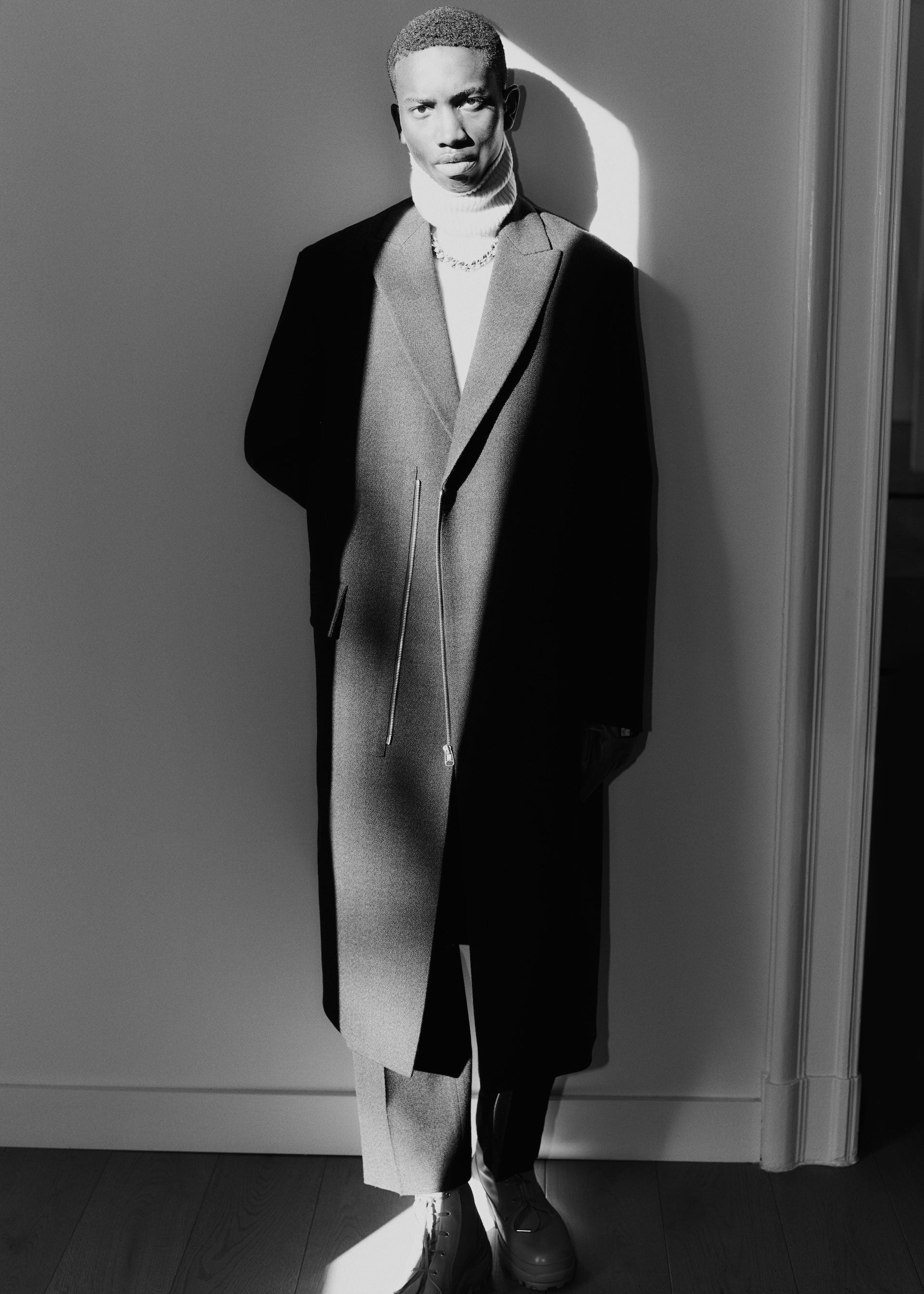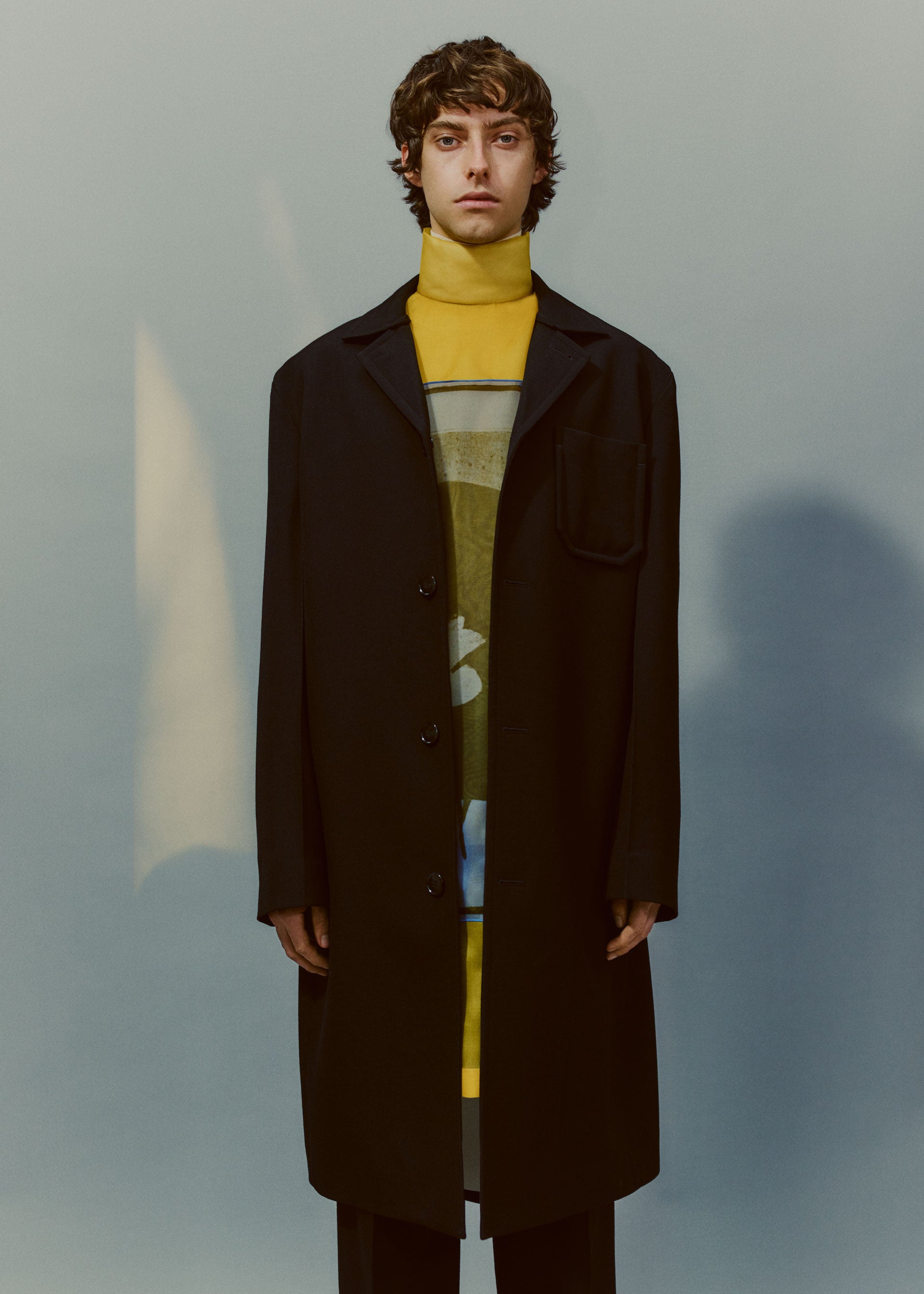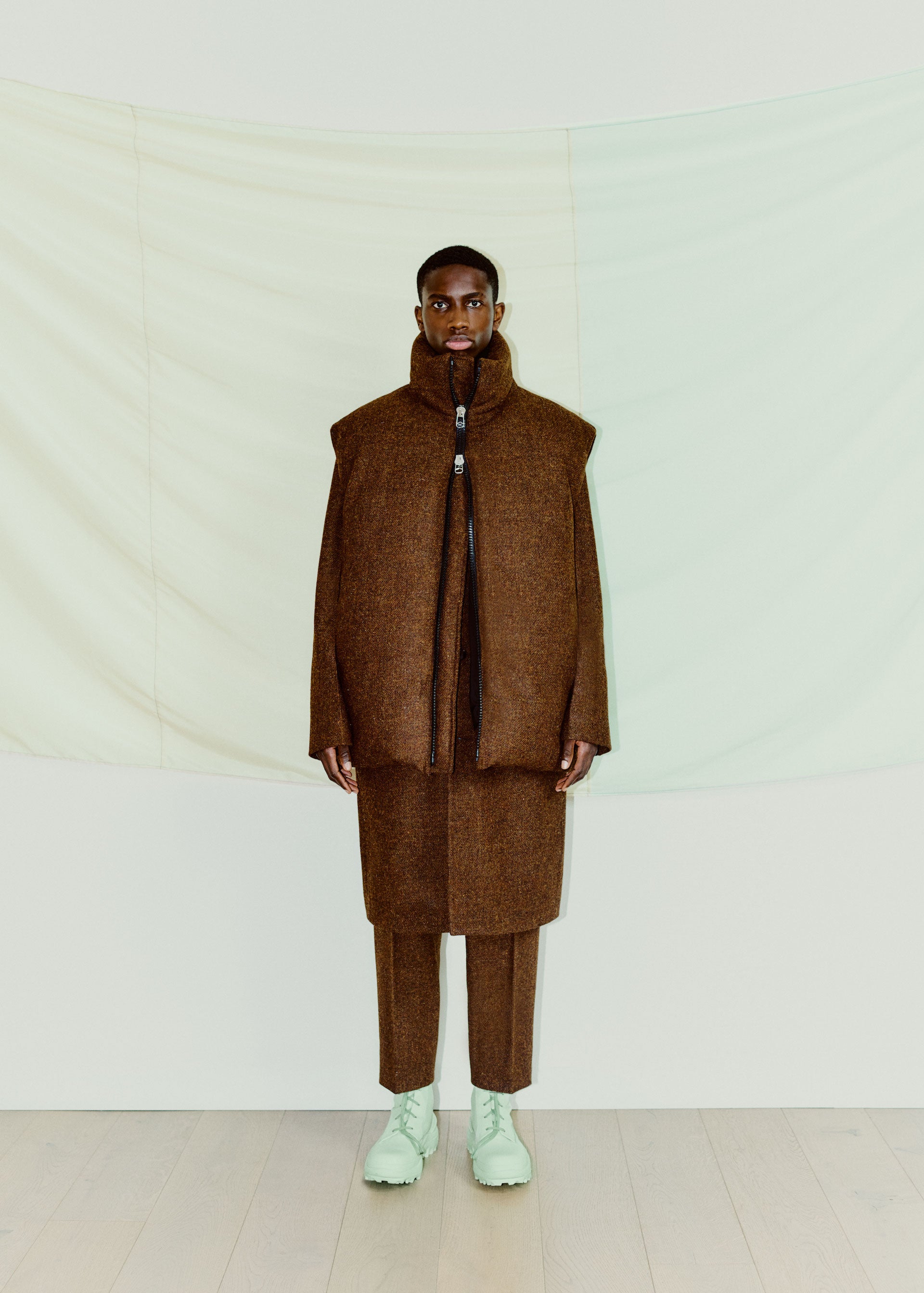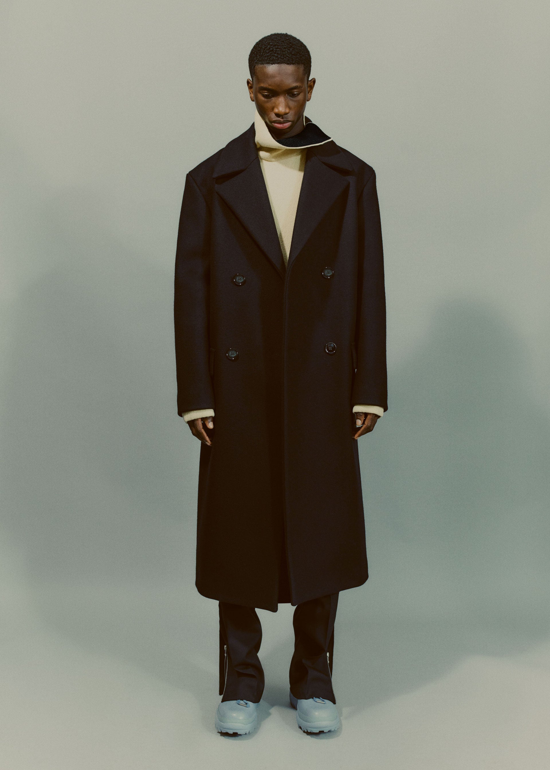 Collages and assemblages. In Rauschenberg’s vocabulary, ‘combines’. The idea of mixing materials, which Rauschenberg gained through his experience in his first year at the legendary black mountain college, under the guidance of Josef Albers. This idea is often at the root of design: finding the correct balance and vibration between two different materials, colors, or techniques, and was the initial starting point for the Fall/Winter 2021 collection. Mixed materials take the form of organza panels applied to sharp Japanese wool or cotton poplin overshirts, chunky knit collars attached to wool coats, and heavy metal hardware cutting through tailoring, shirting, footwear, and accessories.