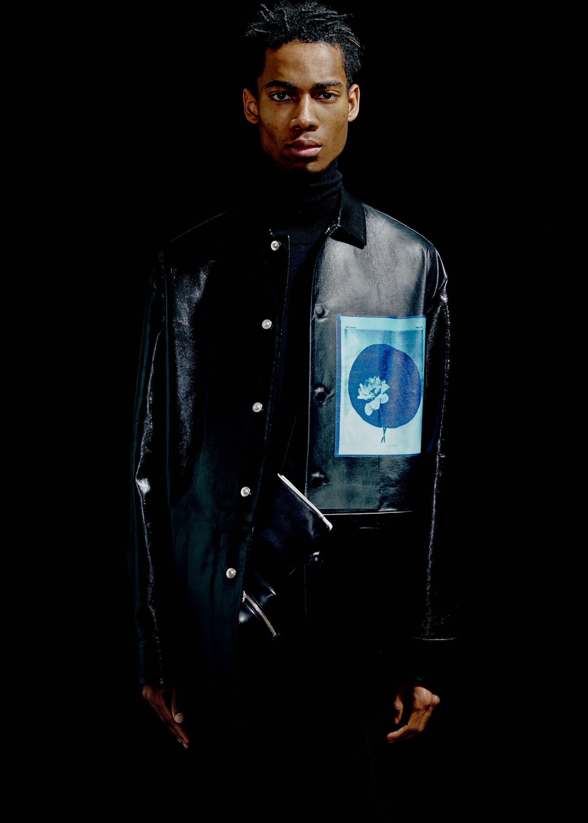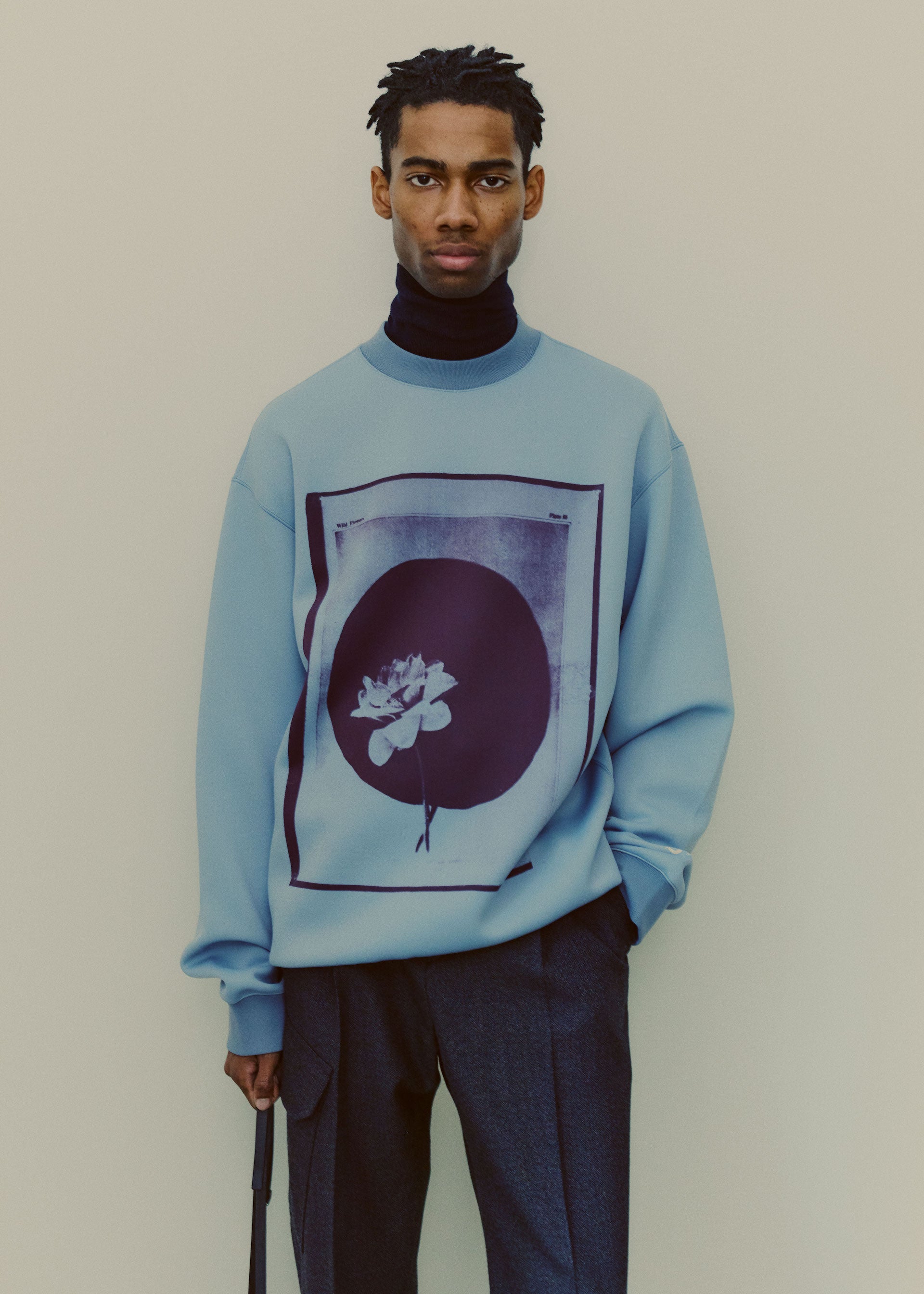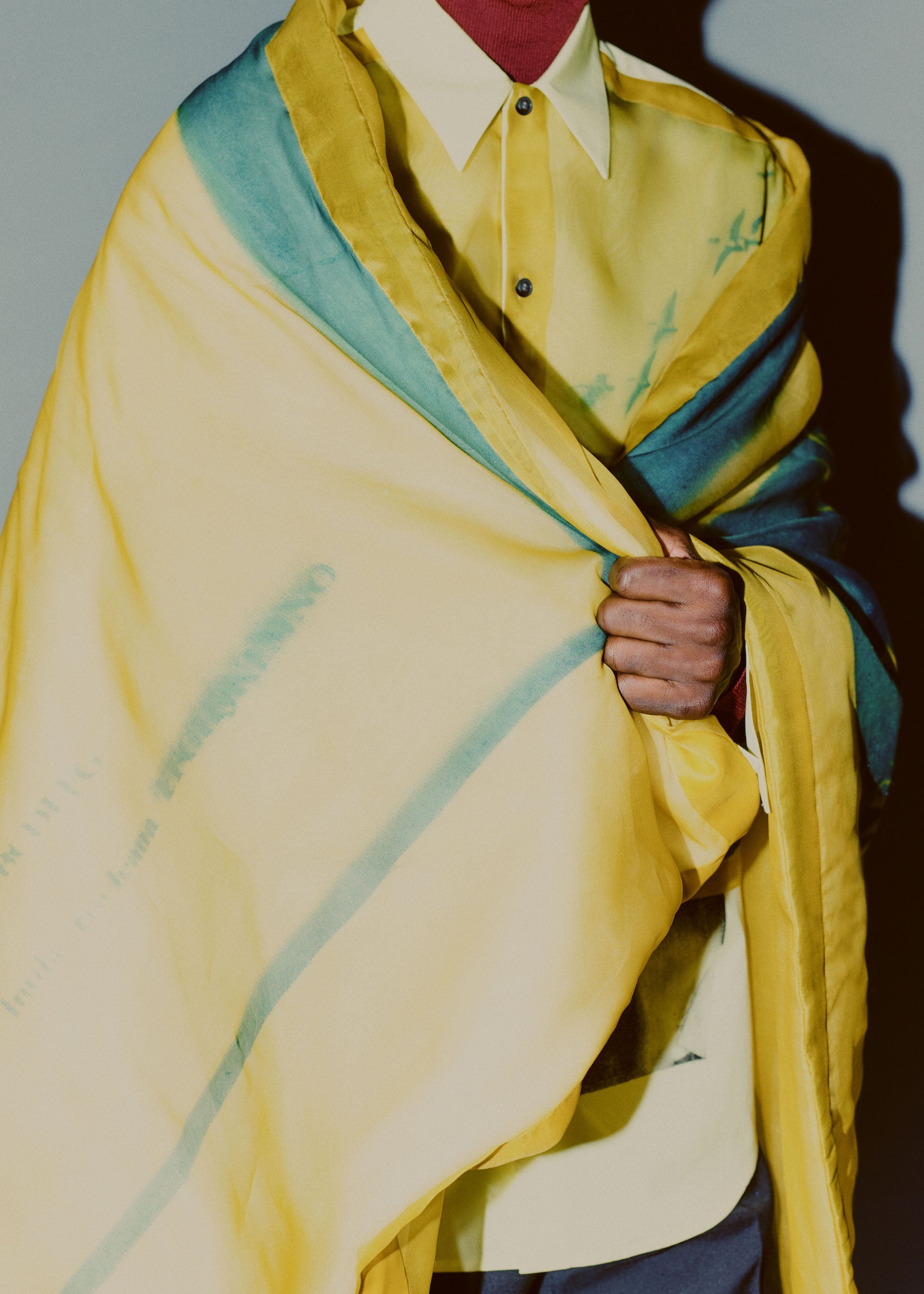 The palette reflects both a sophistication as well as a utilitarian vibrance. Melange Harris Tweed wools in warm brown and petrol are mixed with bright yellow, fuchsia, mint green, and pale blue. Black and white jacquard heavy diagonal wool coating is contrast by deep green, navy, and misty grey. Slick black leather is met by bright blue and ceramic white. Organza in bright green, yellow, blue, and red as well as natural white provides the bases for exquisite cyanotype-derived print motifs in black, purple, and aqua.