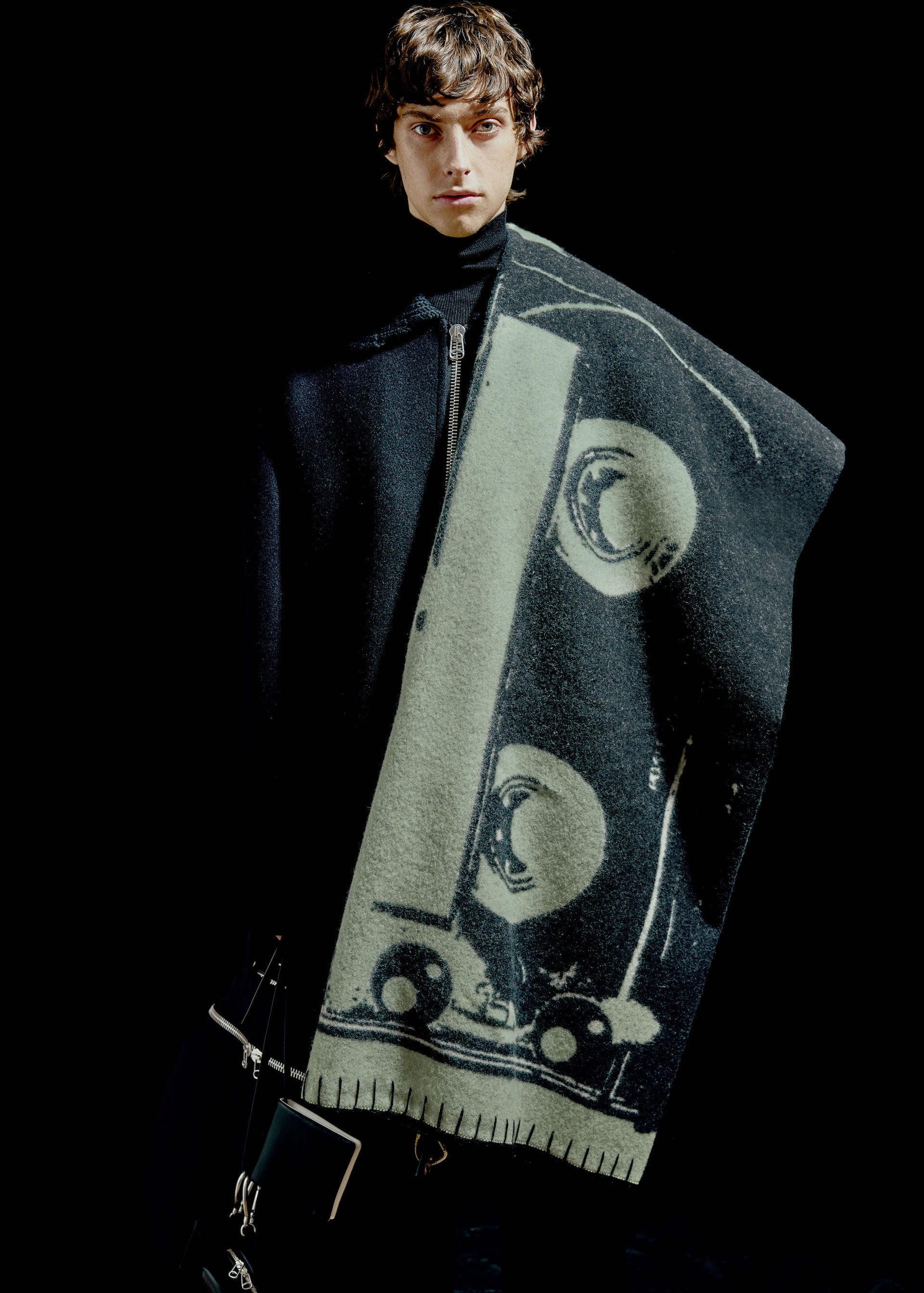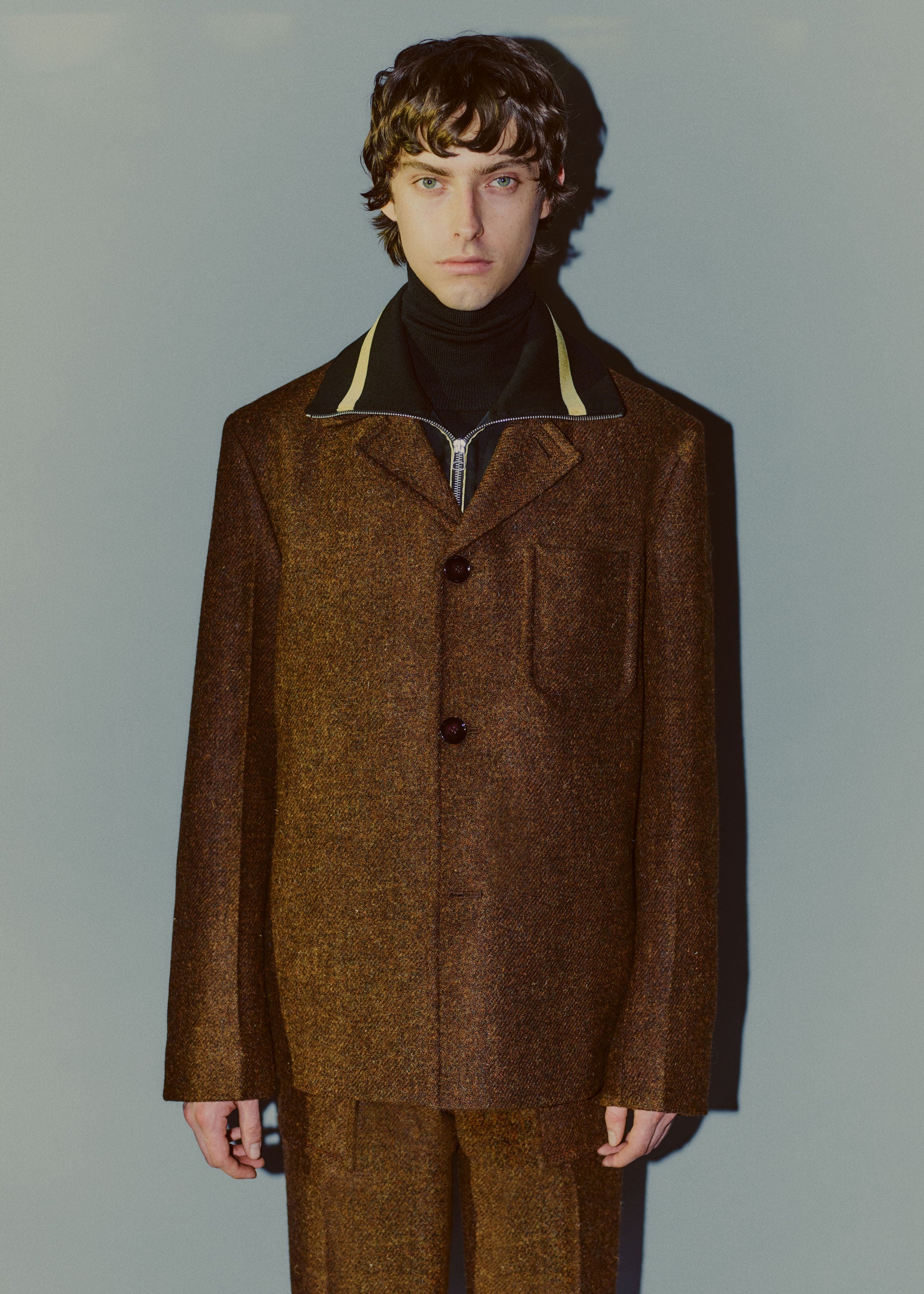 However, beyond the simple opposition of materials, the study evolved into mixing ideas and feelings, a reflection of the place and time we find ourselves in now. Elevated materials utilized in more relaxed shapes, such as track suits and cozy inflated pieces, leather jackets and trousers with elastics and coulisse adjustments, roomy jacquard wool overshirts, and double-faced shetland and viscose/nylon flared collar knits. Garments that can both be worn during long stints at home, or in transit (when possible). The underlying feeling being one that reflects an attitude that even if we are required to remain in place, we still appreciate and desire well made, beautiful things.